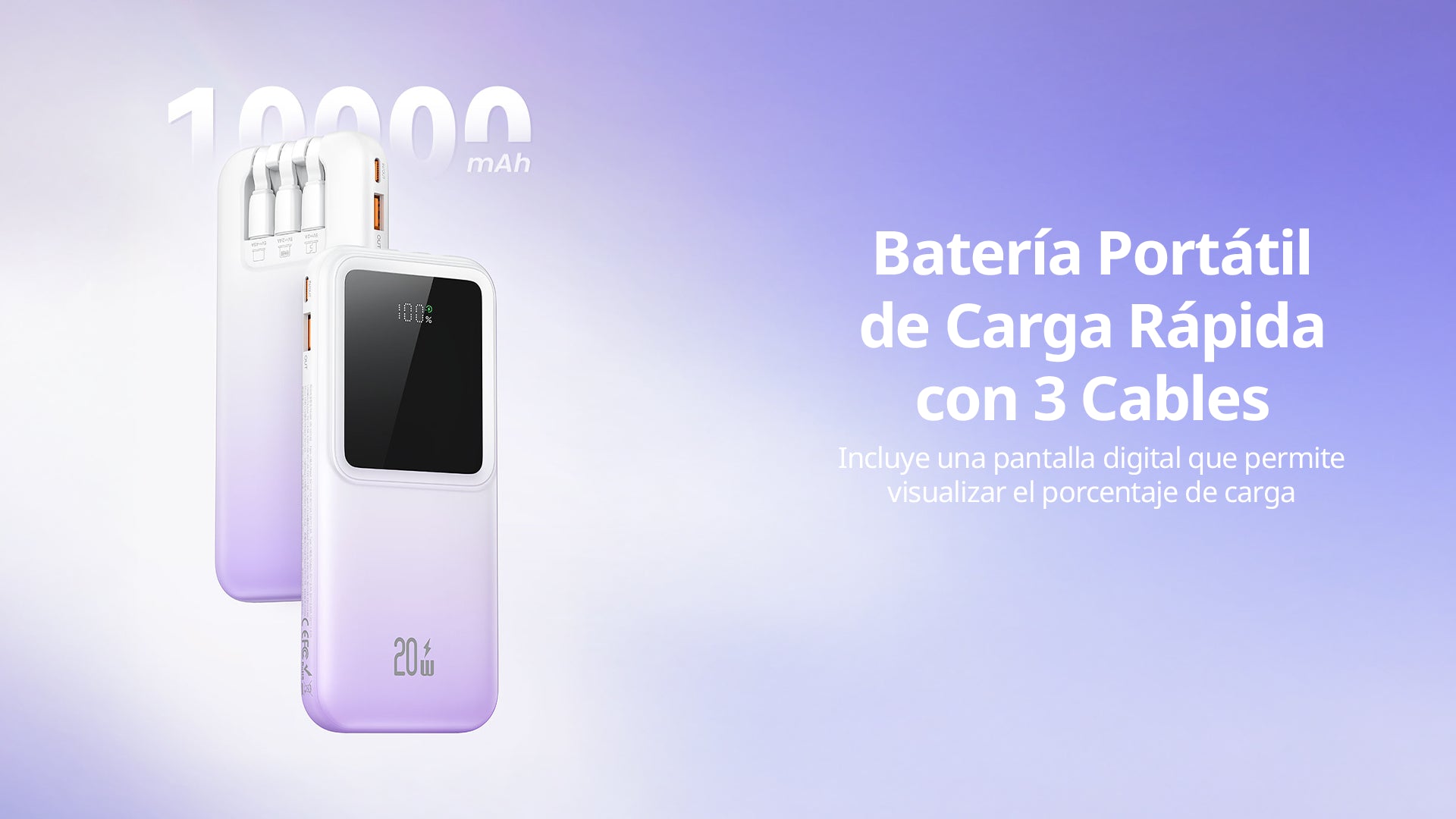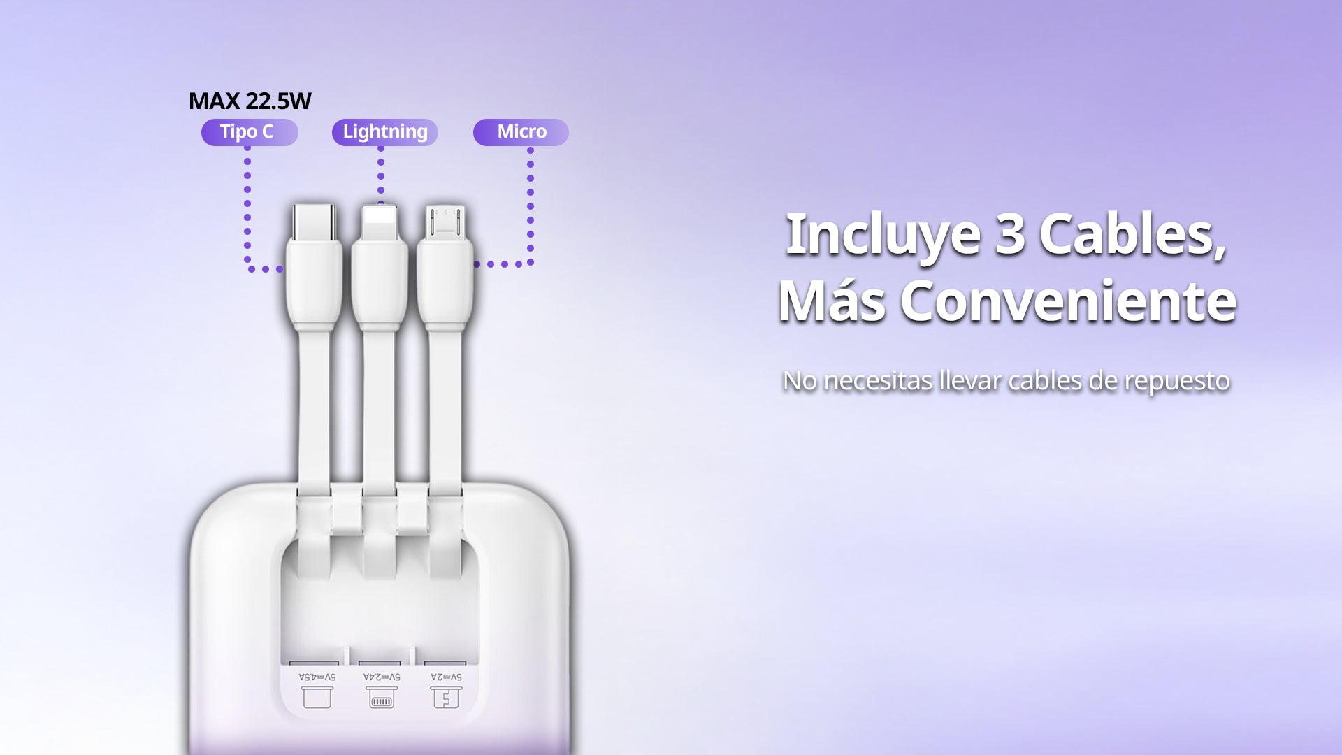 ● 3 cables integrados: Tipo-C, Lightning y Micro USB