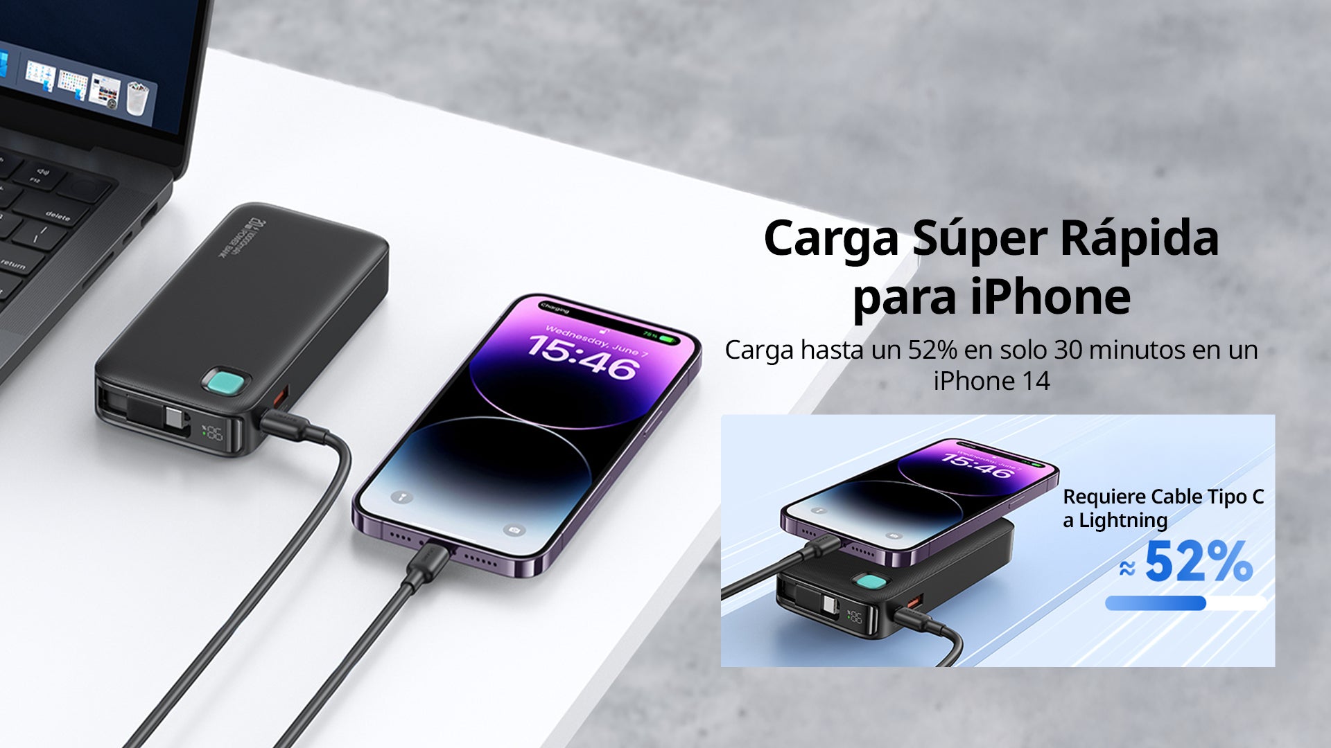 Carga rápida PD 20W – 52 % de batería en 30 min para iPhone 14