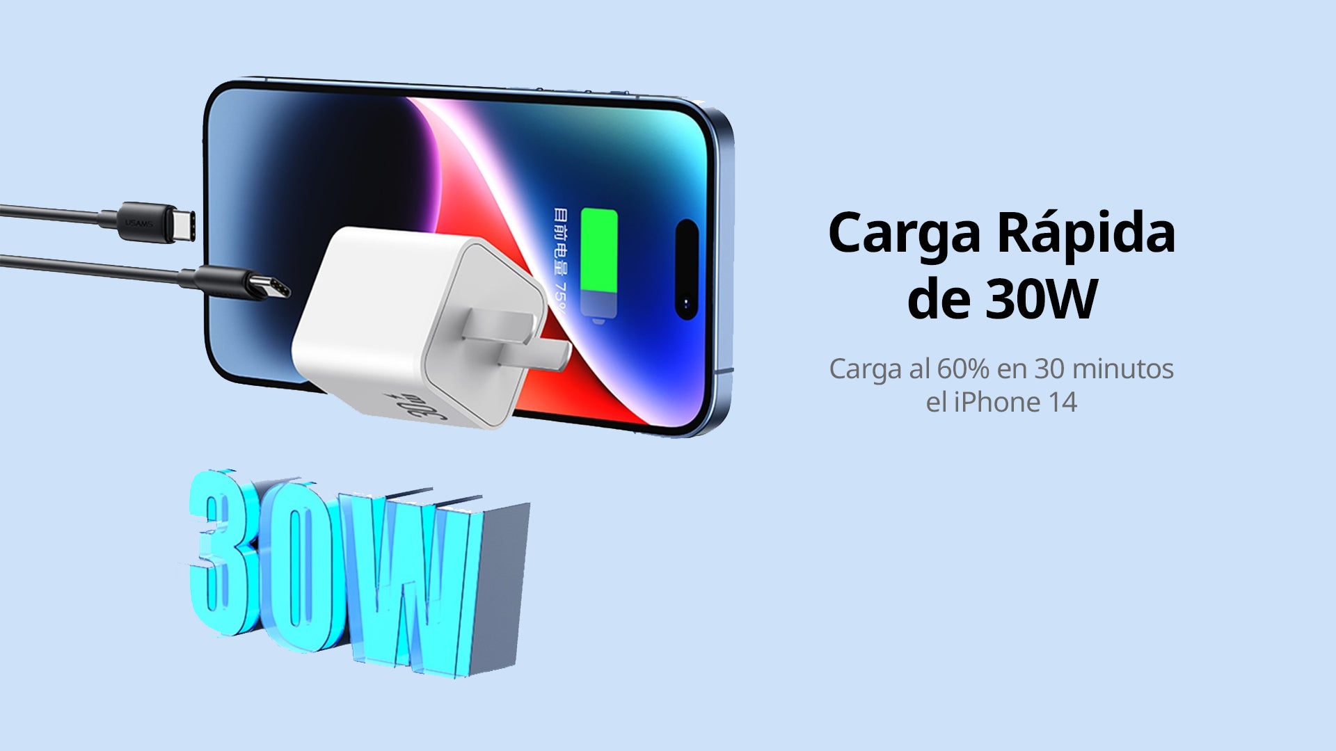 ● Carga rápida PD 30W (52% en 30 min para iPhone 14)